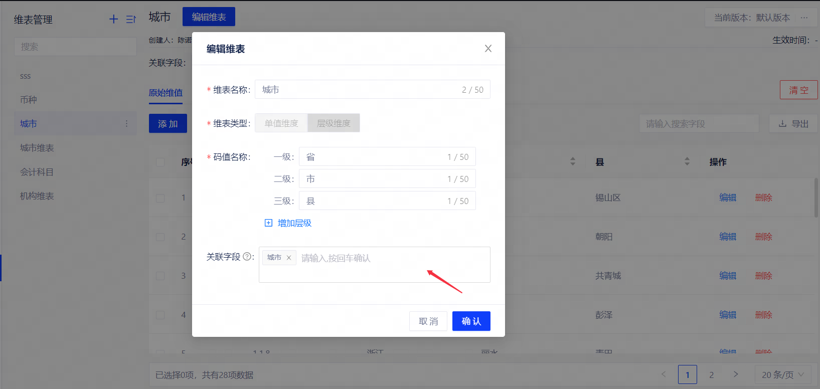 ① 将业务表中的码值(机构编码)字段与维表关联,然后从主数据表中读取(或手动输入)层级关系,码值在哪一级就读取到那一级。下图的码值实际为城市id,则维表只需创建/读取到城市级。