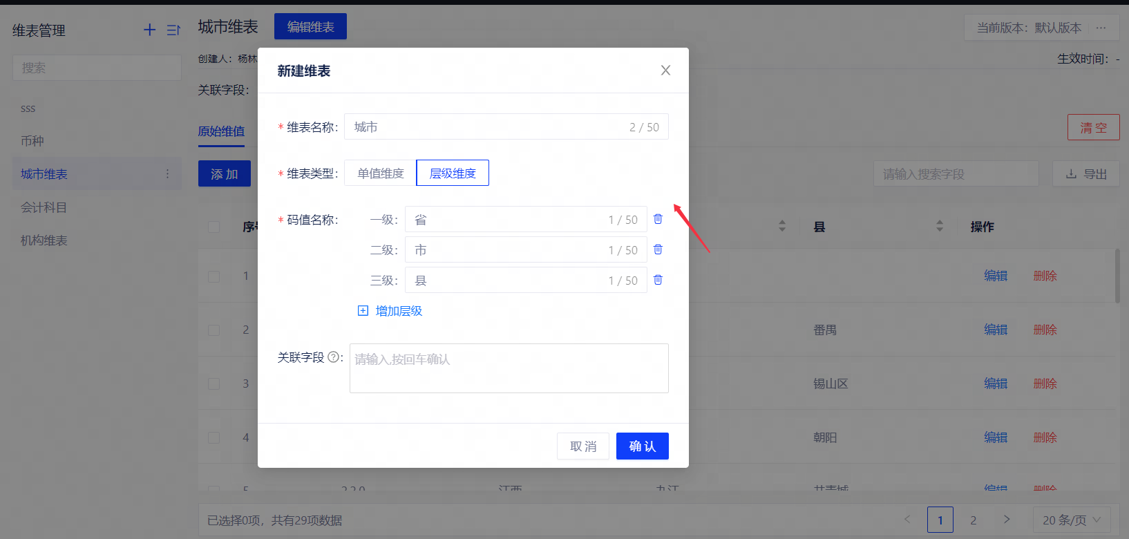 (2) 配置字段关系:层级维表和组织架构之间的层级关系
