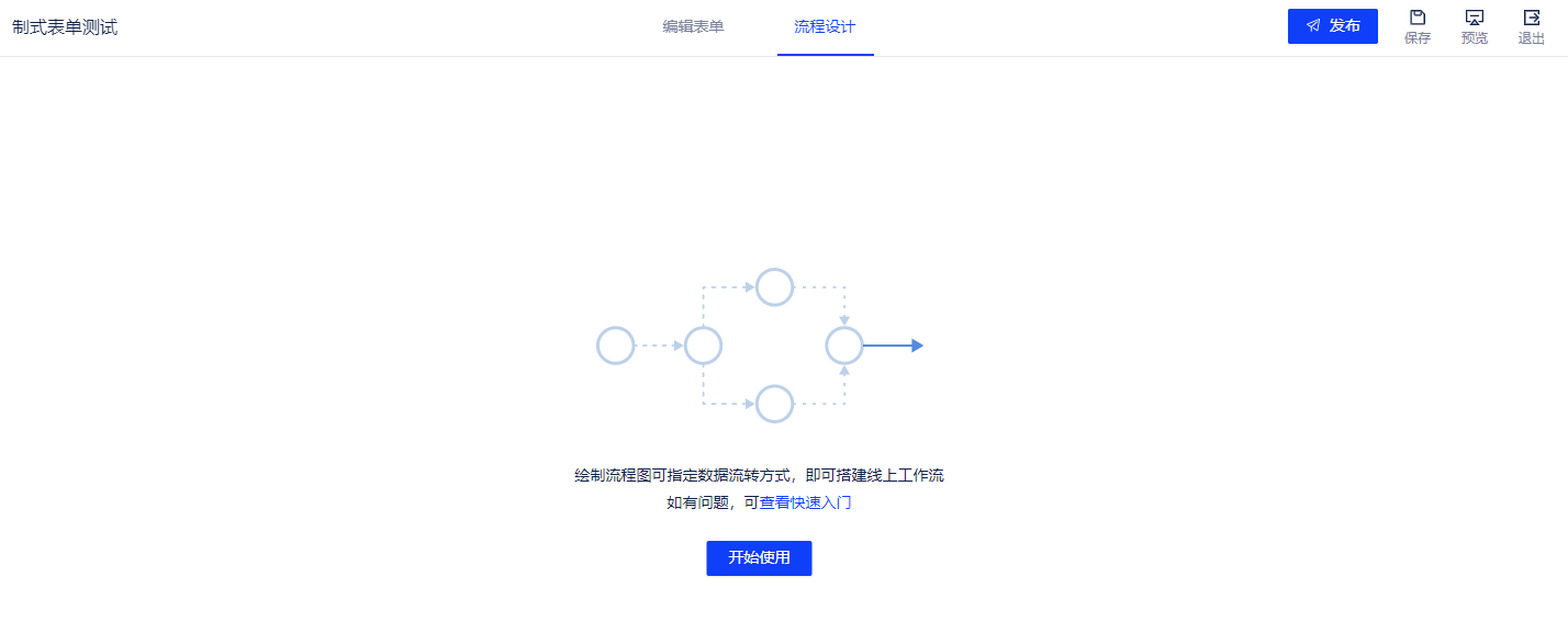 (1)您在完成表单编辑后,点击顶部[流程设计]按钮即可进入该表单的流程配置页面