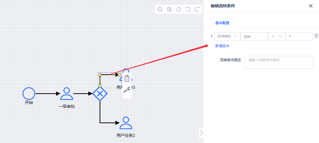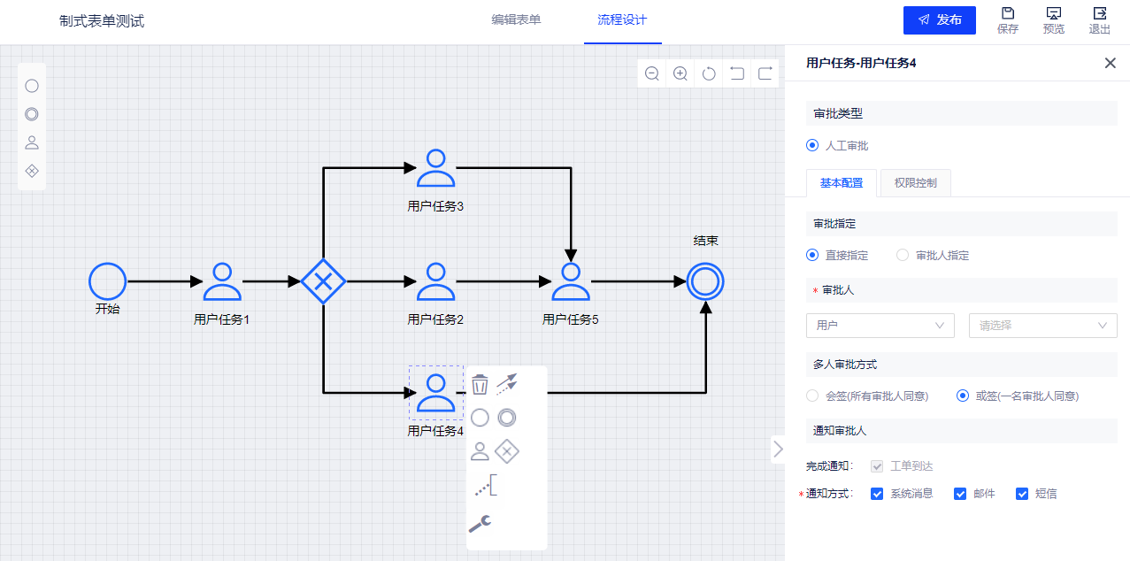 - 用户任务:需要用户完成操作的节点,如审批、编辑;可添加多个,节点间通过线路连接