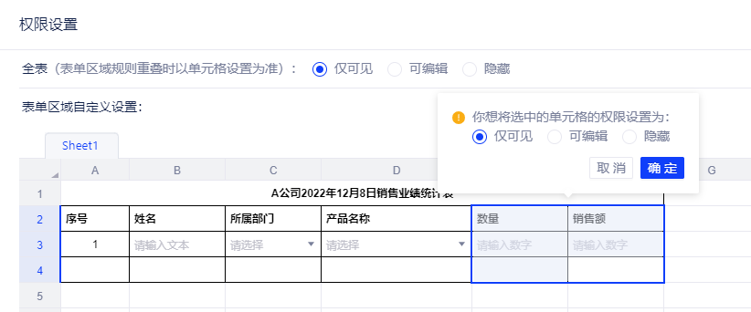 (2)权限控制(节点权限):用于设置节点处理人的可见单元格及可编辑单元格;