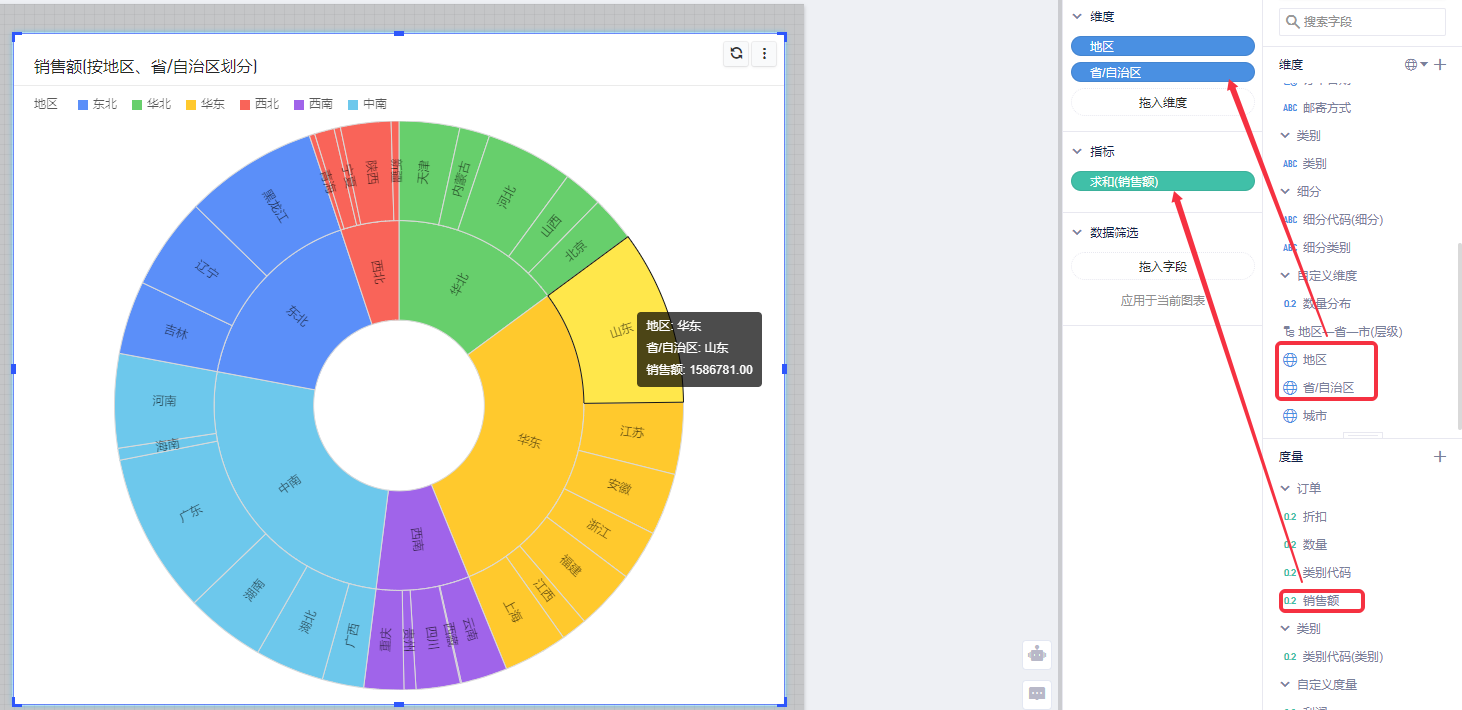 (2)将维度“地区”、“省/自治区”拖入维度区域,度量“销售额”拖入指标区域,即可完成旭日图的初步绘制;