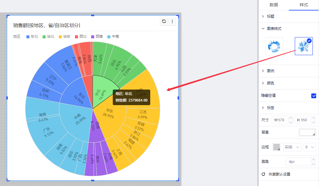 (3)可以在样式面板里对旭日图做一些样式上的调整,如标签显示百分比,更改图表样式等。