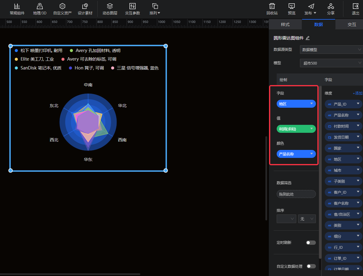 - 字段:设置雷达图的维度字段,如下图所示为“地区”。