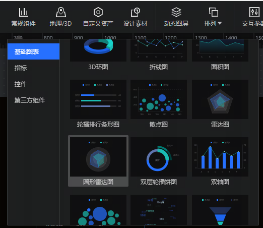 在编辑状态下点击圆形雷达图组件即可对其进行配置,配置内容分为样式、数据和交互三个Tab。(本节仅介绍圆形雷达图特有属性的配置,基础图表共性的配置请参考下文"组件配置")