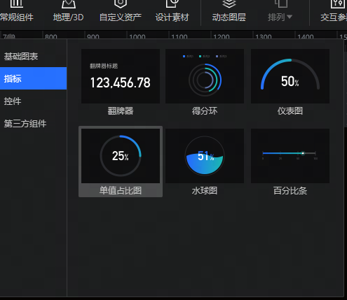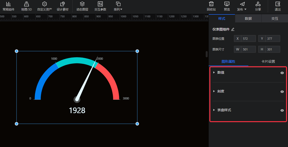 在编辑状态下点击仪表图组件即可对其进行配置,配置内容分为样式、数据和交互三个Tab。