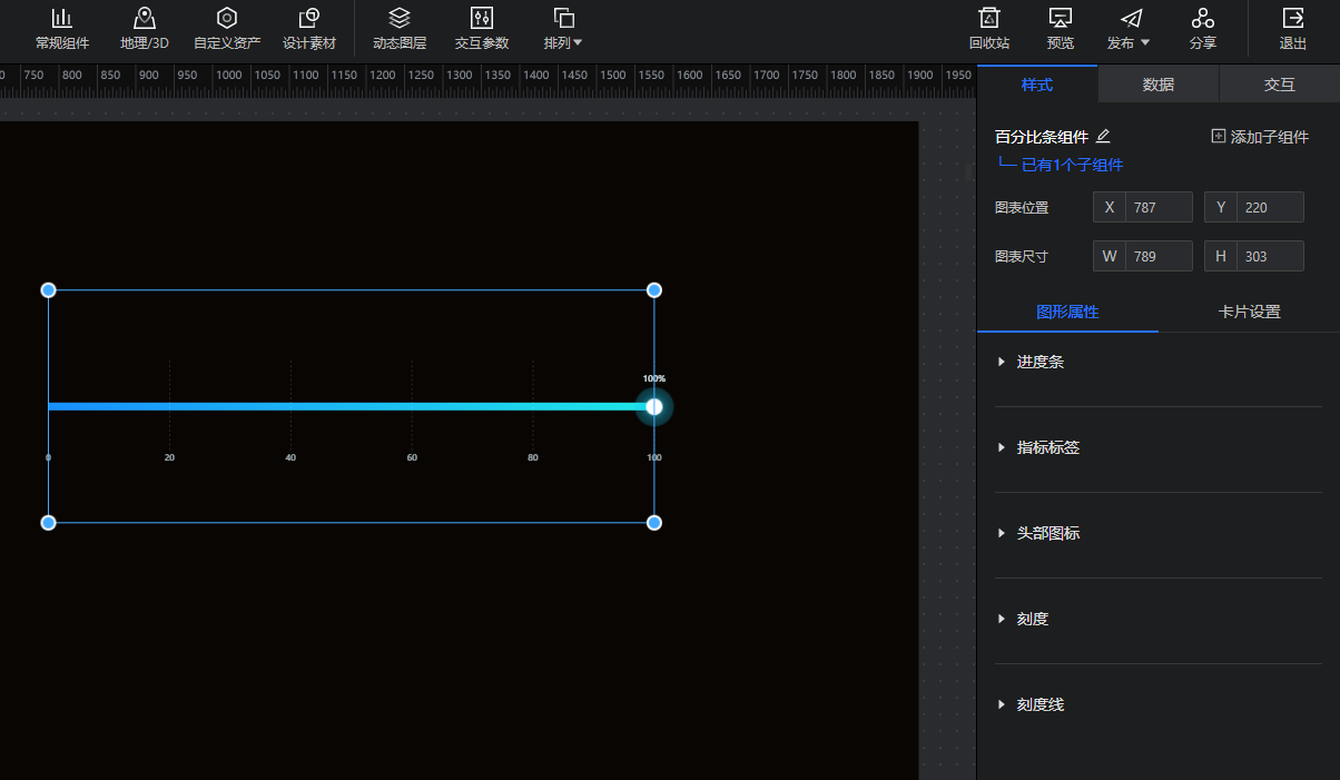 在编辑状态下点击百分比条组件即可对其进行配置,配置内容分为样式、数据和交互三个Tab。