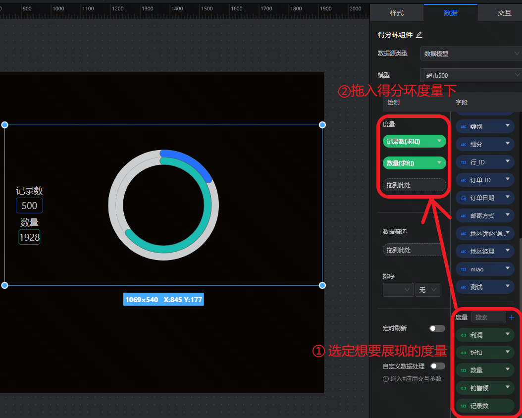 得分环的数据配置:得分环的作用是显示各个度量值占某一固定数值的比例,将度量字段拖入得分环度量下即可。