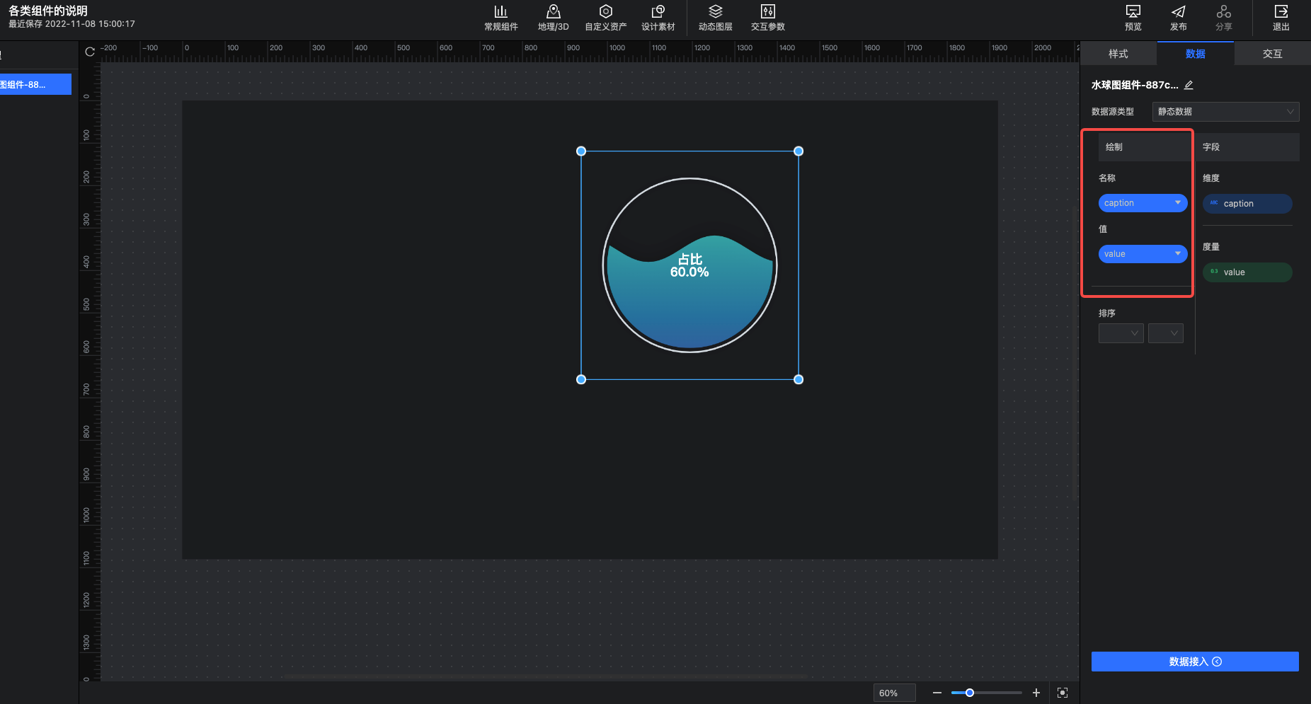 在编辑状态下点击水球图组件即可对其进行配置,配置内容分为样式、数据和交互三个Tab。