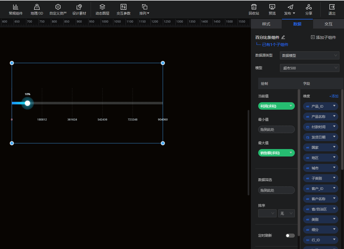 • 最大值:设置百分比条的最大值,为度量字段,如下图所示为“销售额”。